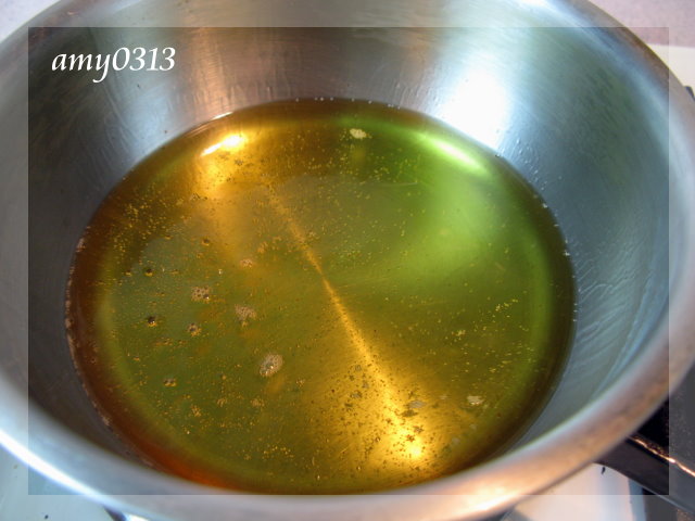 剛開始炸的時候會產生許多泡泡,但慢慢地泡泡會越來越少,這就表示可以起鍋了。紅蔥頭炸到像照片中這樣偏金黃但未到正金黃色就要取出了,餘熱會讓它變成金黃色,如果炸到全變金黃色再取出就太慢了,因為餘熱會讓它變苦。