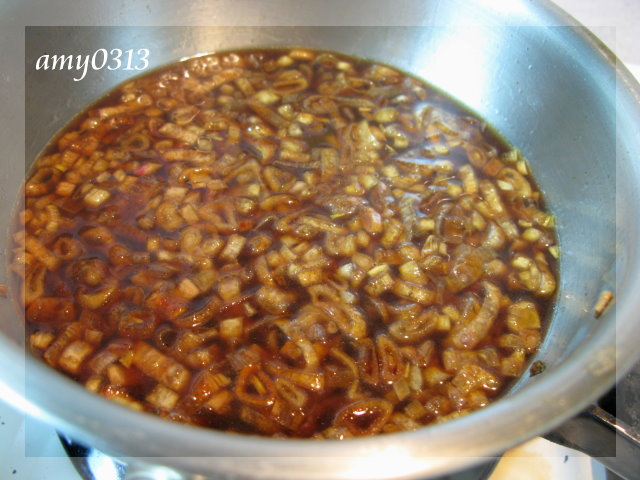 接著把切好的紅蔥頭放入雞油中炸,油溫不要太高,低油溫慢炸,這樣紅蔥頭才不會一下就焦掉了。